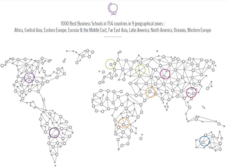 这份榜单涵盖了全球154个国家的1000所商学院:非洲、中亚、东欧、欧亚和中东地区、远东地区、拉丁美洲、北美洲、大洋洲和西欧。
