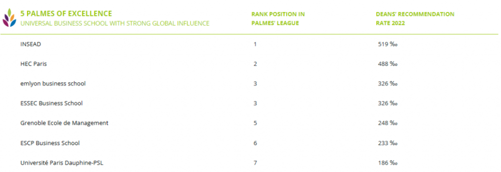 法国一共有47所学校上榜。入榜的法国院校并不全是商学院,其中还包括巴黎政治大学、公立大学及其下设IAE学院。一共有7所学校获得5片棕榈叶,其中6所商学院和1所公立大学。今年,INSEAD排名榜首,HEC商学院则位列第二。ESSEC和里昂商学院并列第三。随后依次是格勒高商和ESCP。巴黎第九大学是唯一获得5片棕榈叶的公立大学,位列第7。
